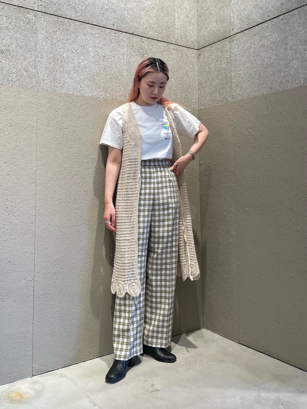 ワントーンでコーディネート。 ▶︎ジレ 158cmで膝下の丈感です。 身幅は結構すっきりめで、紐で結んで調節できます。 とても軽いのでレイヤードしやすいですし、季節問わず使えるので1枚持っておくと重宝するアイテムです! ▶︎Tシャツ ゆったり大きめです。 着丈もしっかりあるのでお尻は隠れる長さです。 生地も厚手過ぎないのでインスタイルもしやすいです◎ ▶︎パンツ 158cmでMサイズ着用。 ウエストは後ろゴムで、サイドにボタンが付いていてサイズ調節可能です。 ハイウエストでセンタープレスもはいっていて脚長効果抜群です、、!!! すとんと落ちるシルエットはカジュアルながらも綺麗に履いて頂けるパンツです。