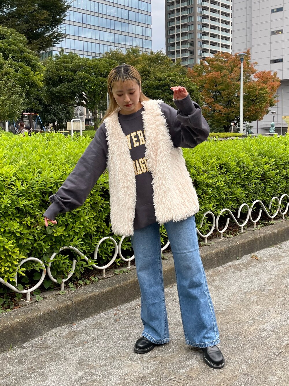 スウェットにファーベストで鉄板コーデ^ ^ 骨格:ストレート ▶︎ファーベスト 毛足長めのボアファーです。 とても柔らかく滑らかなので肌触りは抜群です◎ また軽くて袖口も大きめなのでインナーにゆったりしたサイズ感のものも合わせやすくレイヤードもしやすいです。 ▶︎スウェット ビッグシルエットで丁度お尻が隠れる着丈です。 程良い袖ボリュームもしっかりリブで止まるのでメリハリがあります。 裏毛なので通年通して着やすいのがいいですね◎ ▶︎デニム 26のサイズ着用です。 オーストラリアのデニムなので長めの丈感です。 小柄な方だと厚底かヒールか、丈詰めしてしまった方が綺麗に履けると思います。 私は158cmでギリギリ靴にワンクッション乗る感じで履いてます。 生地は柔らかいのでとても着心地がいいです◎