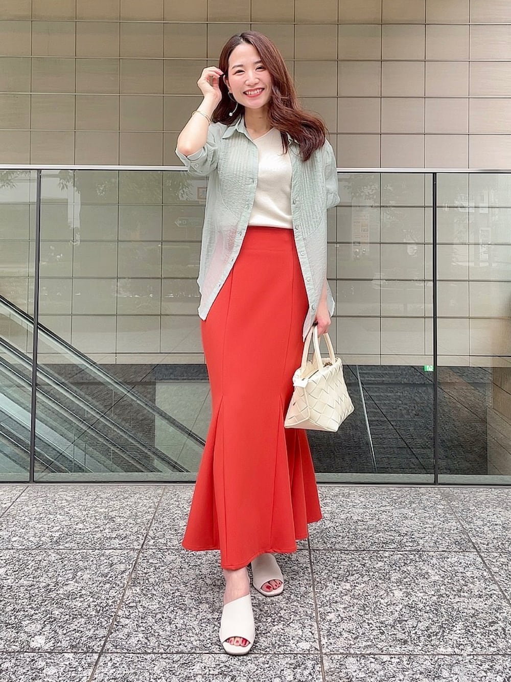 オレンジのスカートはこの夏めちゃくちゃ 着回してます⭐︎ 今回は爽やかなグリーンのシャツと白を組み合わせることで、真夏のビタミンカラーを フレッシュなイメージにしてみました。