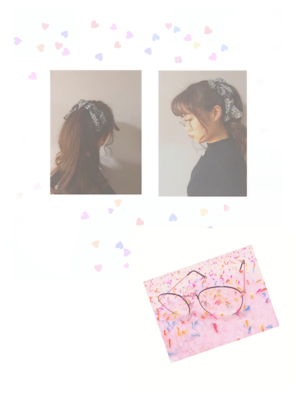 巻き髪ポニーテールに スカーフを巻きつけました! サイドの髪も巻いて メガネをかけて おフェロスタイル?笑🙈💋 伊達メガネは 細いフレームのが今年っぽいみたいです!🤓