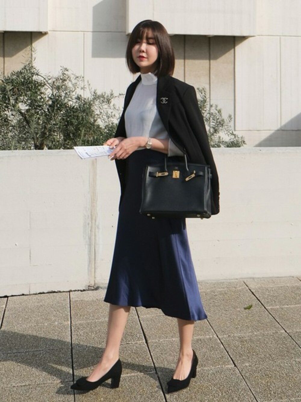 ジャケットできちんと感を出しつつスカートの素材で遊びをプラス♡ 足元のヒールのストーンがポイントになって、オフィスコーデも週末コーデに👌 どこにでも行けちゃう万能コーデで美術館なんてどうですか??🎨
