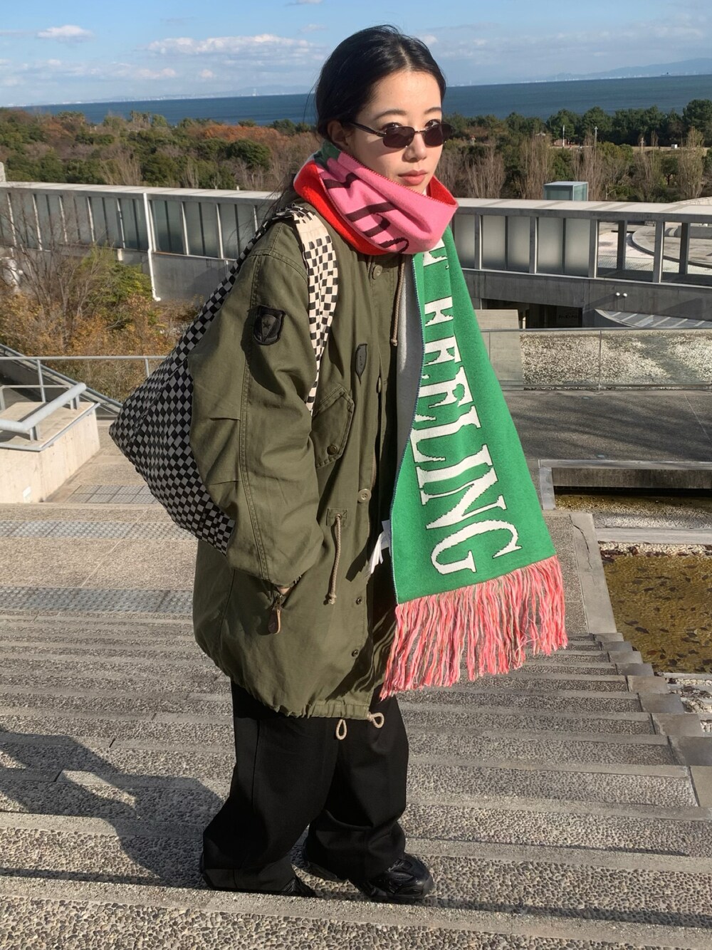 マフラーがカラフルでポイント! カーキの色味に合わせて、リップもくすみカラーをチョイス! チークは薄付けでシャープな印象に