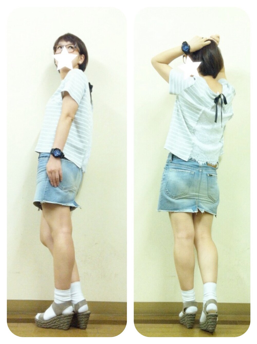 今日は後ろが可愛いボーダーTを 着て来たもんだから、 後ろを見せたくて見せたくて、 四苦八苦したw 女子な格好に、 メンズなGショック♪ トップス*アーバンリサーチ スカート*LEE