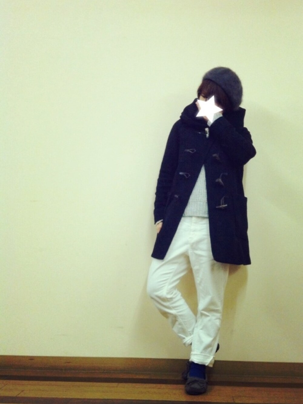 アウター脱ぐと 白いコーデ★ 淡いグレーのニットと白いパンツ グレーのミネトンカにグレーのベレー グレー×ホワイト ポイントは靴下のブルー♪