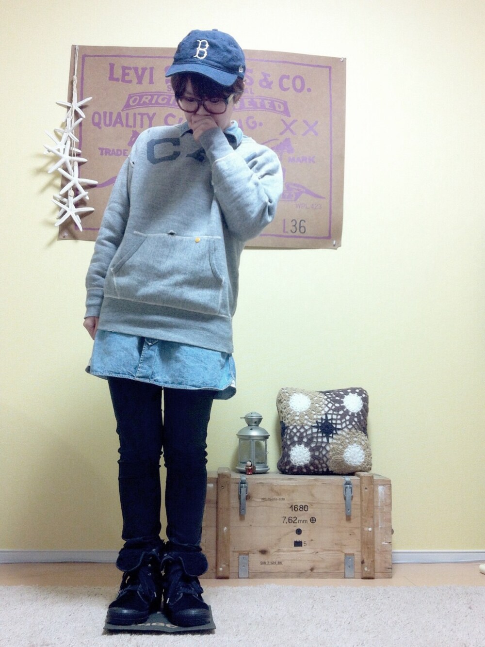 寒くて寒くて ワンピースにスキニー☆ 足元はボアスニーカー かなり、ぬくぬく♥︎ シャツワンピ*ROSSO スウェット*BEAMS パンツ*LEE スニーカー*BEAMSで昔買ったやつ キャップ*NEW ERA