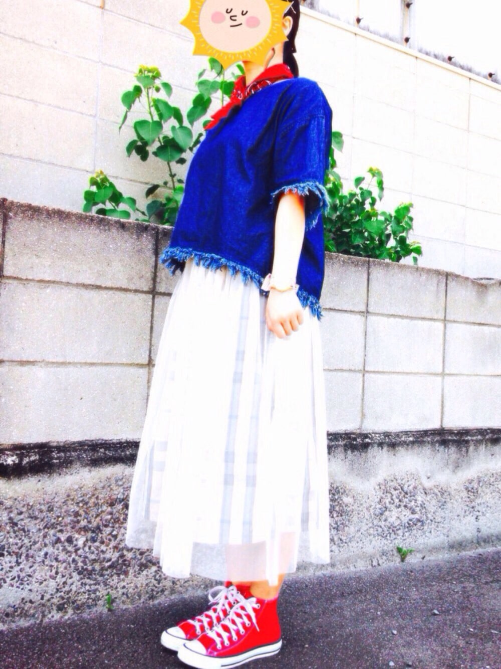 コンバースの赤とバンダナの赤を合わせました🎈😇 スカートは見えにくいけど 二層になっててリバーシブルになります💫万能さんです🙆🏻💕