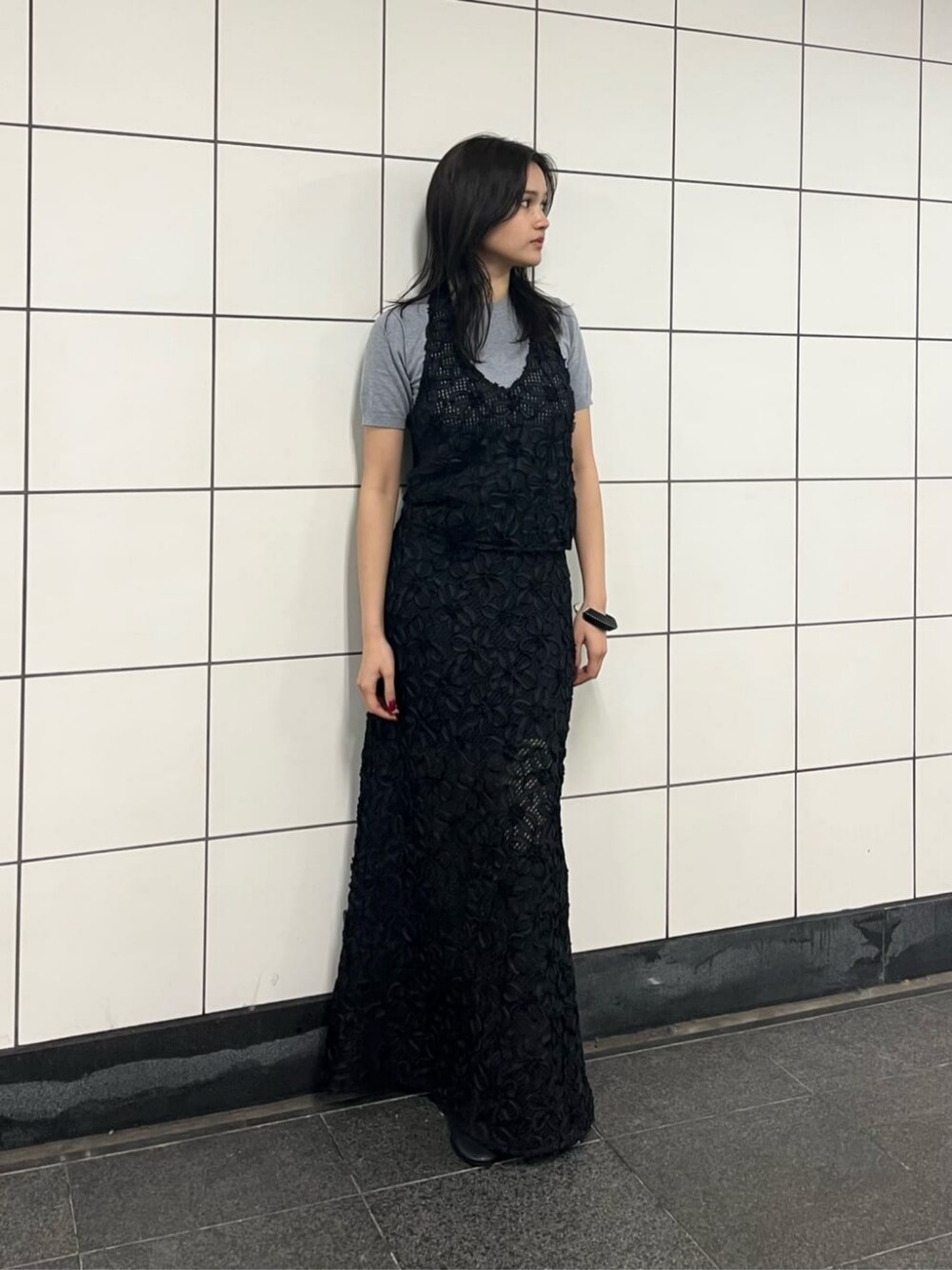 【サイズ感】 インナー: ややぴったり ホルターネックトップス: 普通 スカート: 普通 【コーディネートポイント】 フラワーモチーフのトップスとスカートを合わせてフェミニンな雰囲気にいたしました。 スカートにはスウェットやTシャツを合わせてカジュアルに着崩していただくのもおすすめです。