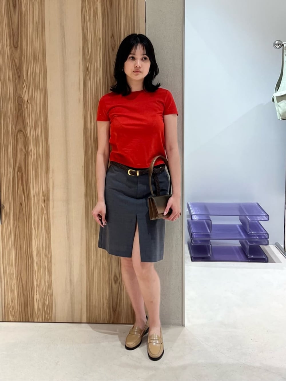 【サイズ感】 Tシャツ: ぴったり スカート: 普通 ローファー: 37着用(通常38) 【コーディネートポイント】 Tシャツにオフィススタイルのようなスカートとローファーを合わせて真面目な雰囲気にしました。コンパクトなサイズ感とスカートのスリットで程よく女性らしさも出しました。