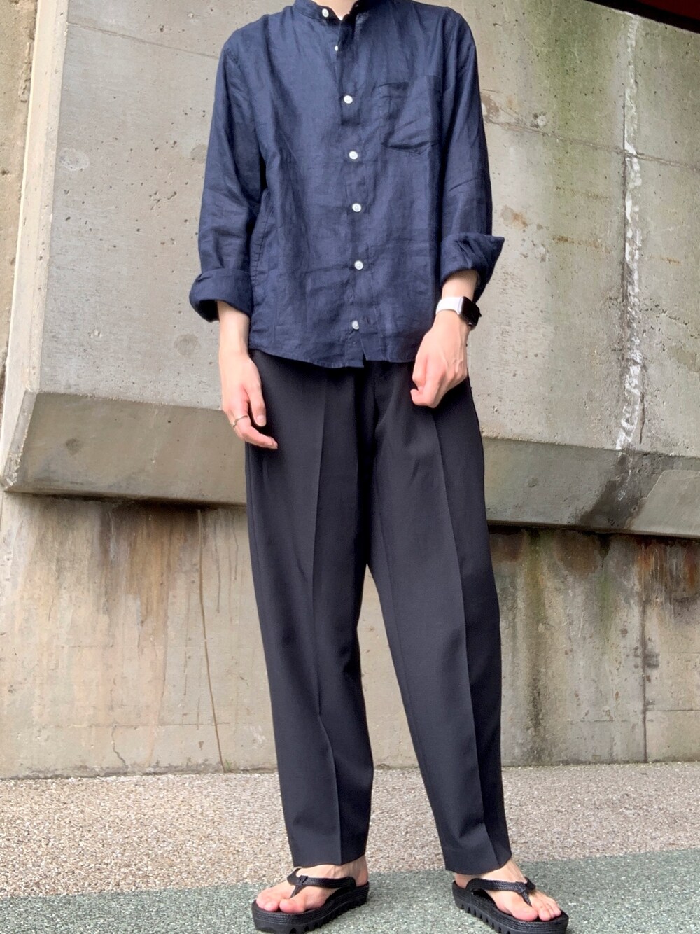 最近無印良品で購入したリネンシャツでコーディネートしてみました! シンプルに黒×紺の組み合わせは最強。