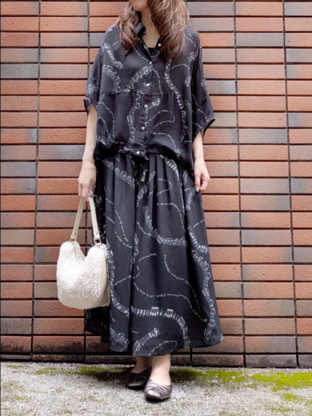 【ブラウス】 2025年秋冬のシーズンテーマ「白鳥の湖」の楽譜をモチーフにした KATHARNEROSSのオリジナルプリントてす。 五線譜と音符を繊細に描き、流れるように物語のあらすじを英文でデザインし、従来のKATHARNE ROSSのブランドアイコンである花柄プリントとは 違った新しいプリントです🎶 シーズン長く着ていただけるポリエステル素材で 残暑厳しい秋に着やすい袖丈で 全体的にふんわりしているので 風が通る感じで 快適に着ていただけます。 裾は ドローストリングをきゅっと絞れば 丸みを帯びたシルエットになります。 個人的には ウエストインが苦手なので ドロストリングして 短めに着れるデザインが とても着やすいです。 【スカート】 ブラウスとセットアップのスカートです。 タックフレアーで ふわっと華やかなシルエットです。 ウエストは 後ろがゴムです。 ブラウスとセットアップで ワンピース風に着て頂くと 音符プリントが さらに華やかに 目を惹きます🎶 【タンクトップ】 機能性抜群のタンクトップ「サラリスト」のスクエアーネックです。 汗ジミが目立ちにくい脇汗パット付きのデザインです。