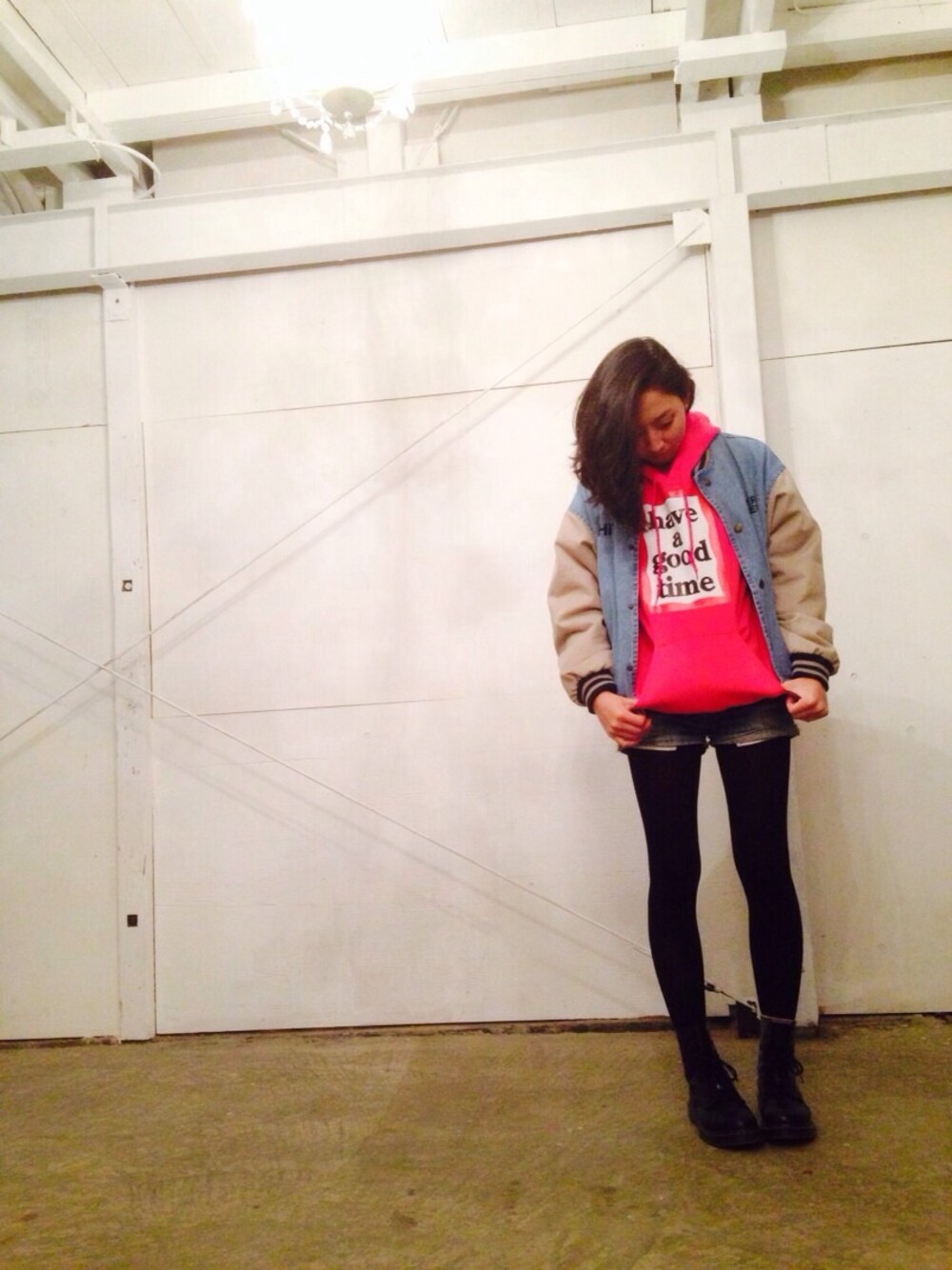 中目黒のHave A Good Time からついにピンクパーカー発売ー!(^^)♡ デニムジャケットは同じ店のHomerunというブランドのもの〜♡ 靴はDoc. Martens ♡♡