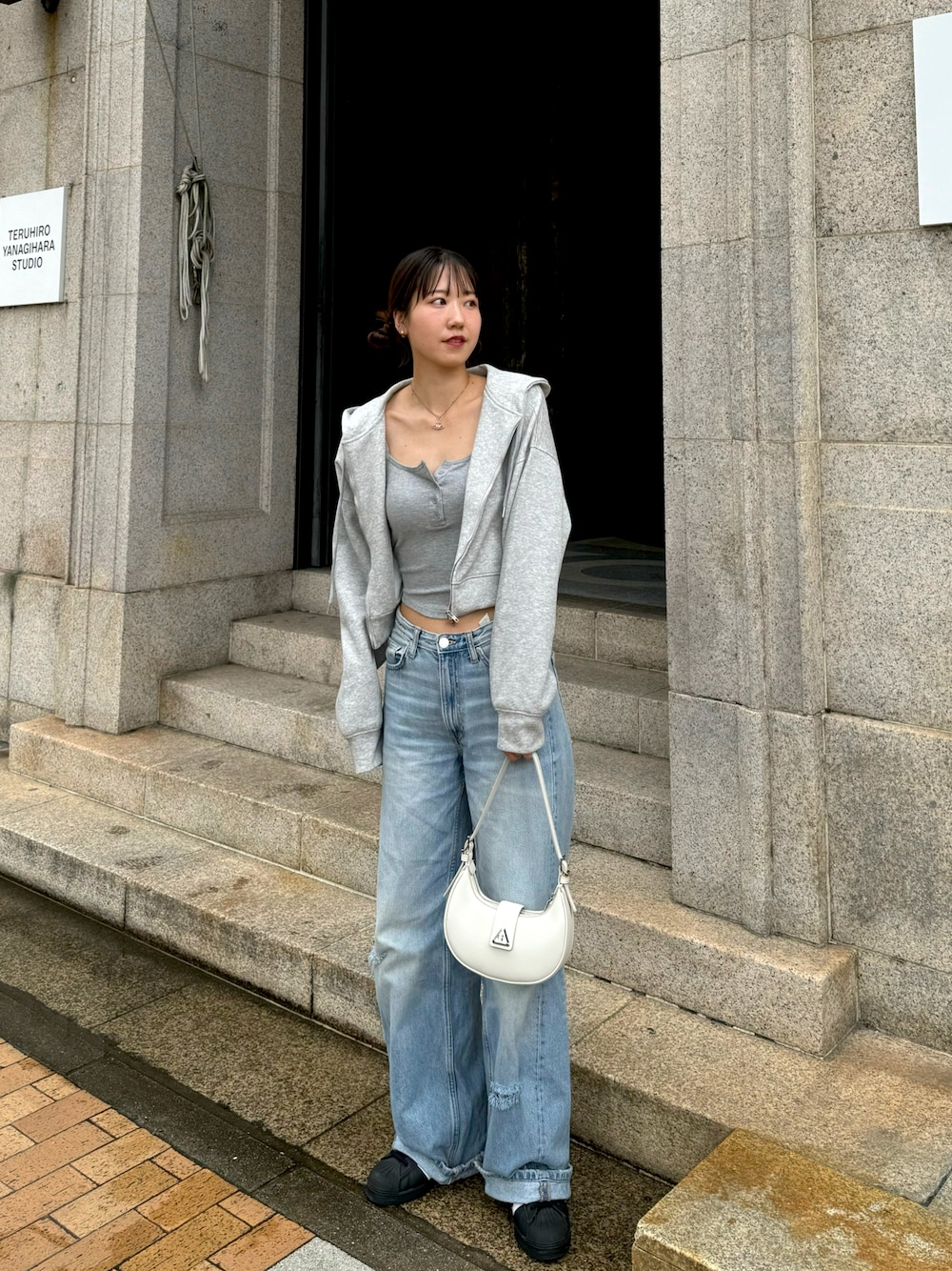 グレーのスウェットパーカーが丈感すきすぎて秋大活躍の予感しかしない。、
