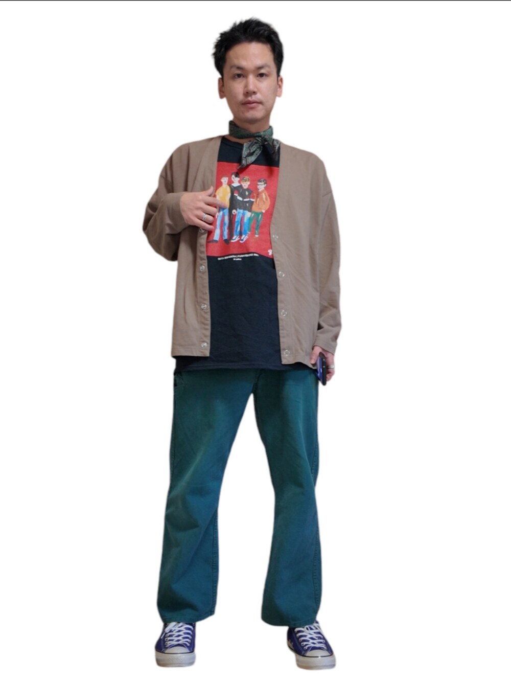 まだまだ暖かい日が続きます。 イギリスのバンド blurのメンバーが描かれたTシャツを着て、薄手の鹿の子コットンカーディガンを羽織ります。 色味だけは秋を意識したカラーリングで お出かけしたいと思います。