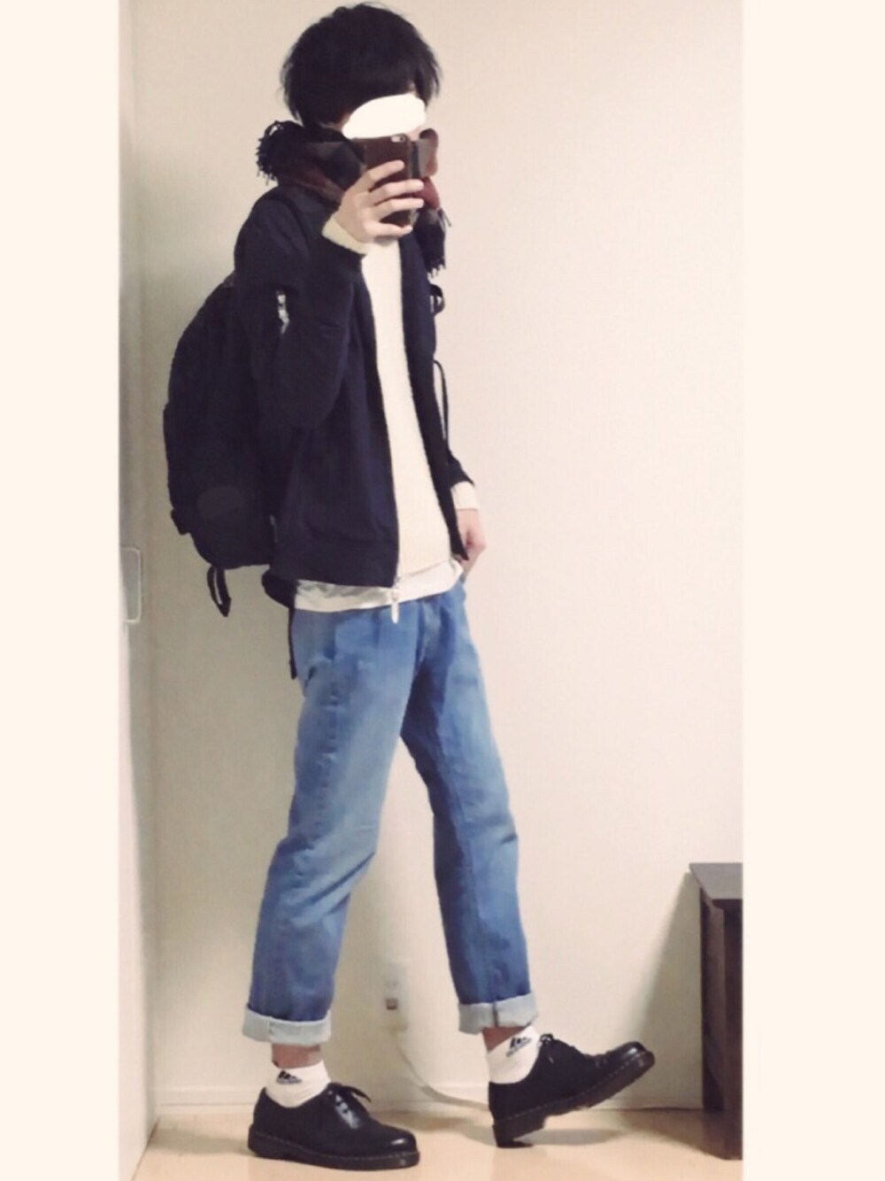 おはようございます☀️🐺 久しぶりの投稿です( ˙-˙ )! ネイビーのMA-1に白ニット、 マフラーに柄、靴下にロゴ で全体的にシンプルにまとめました😑