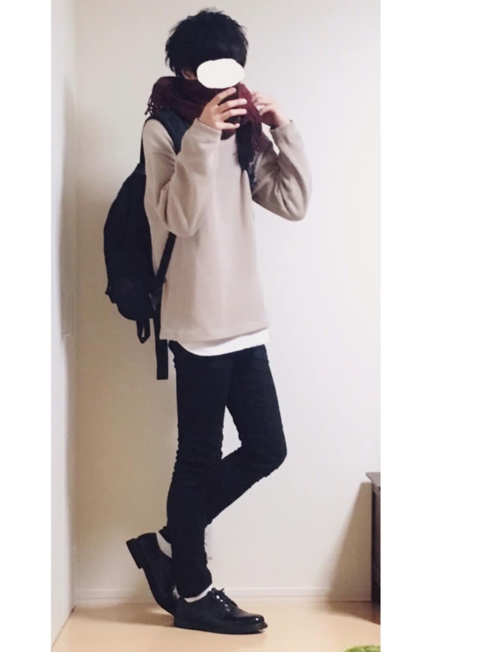 ベージュニット×黒スキニー×ボルドーマフラー🎃 マフラーでワンポイント🍁🙃