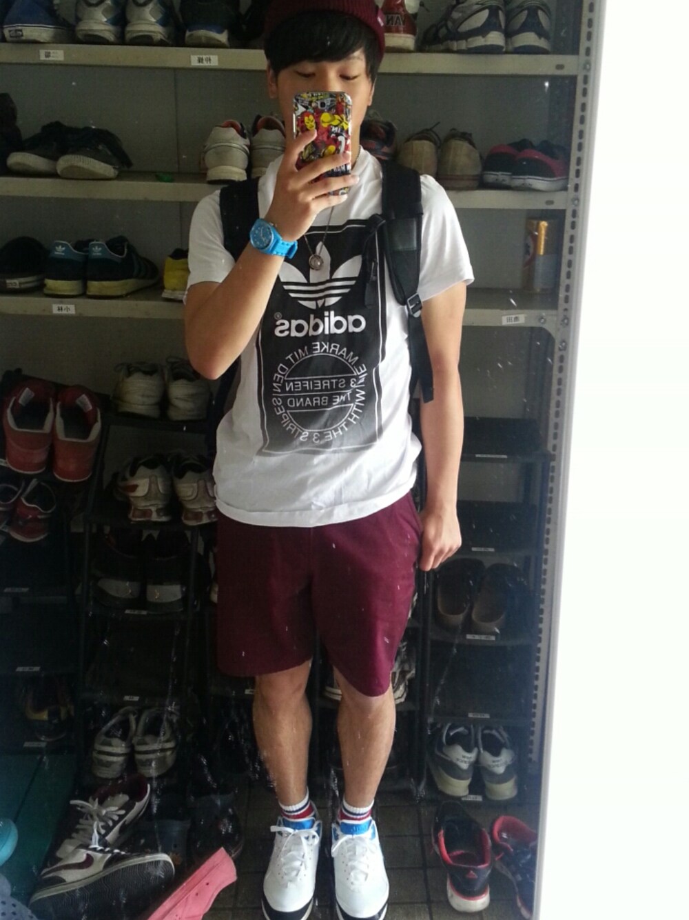 昨日買ったもの着てみた! 大学行ってきます♪ #アディダス(シャツ、腕時計) #BEAMS(ニット帽) #WEGO(ソックス、パンツ) #Nike AIRMAX(靴)