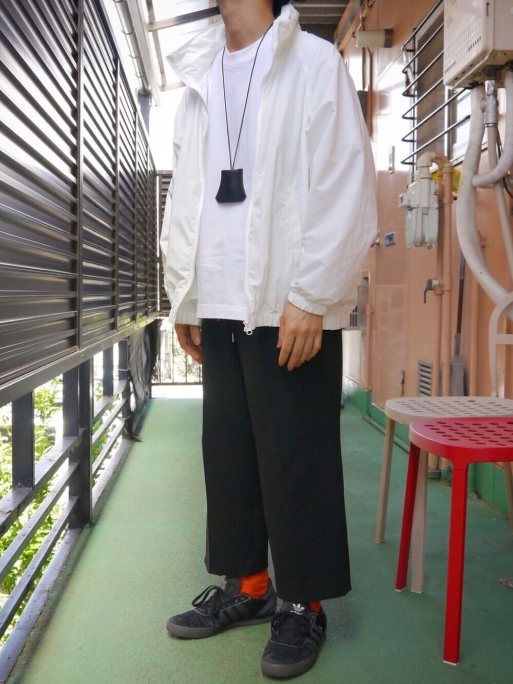 ナイロンジャケットはユニクロのレディース。この安さなら白でも気兼ねなく着れます。本日のテーマは「体育教師をアップデート」です。ネックレスが笛に見えてきます。