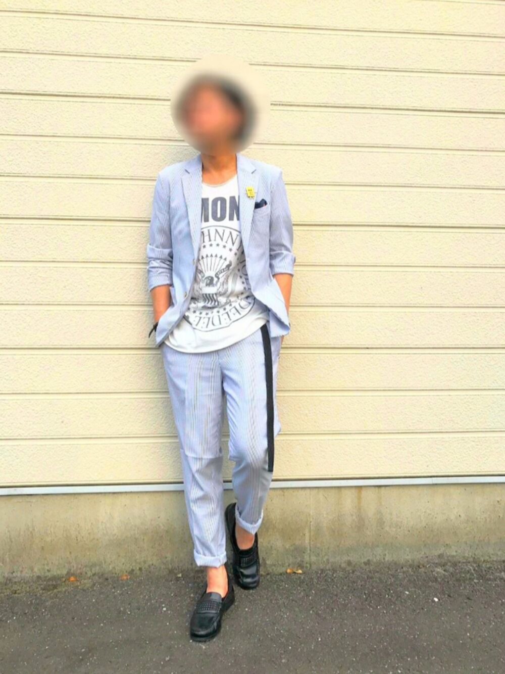ご覧頂きありがとうございます‼️ いいねやセーブ、フォロー、コメントいつも本当にありがとうございます(>д<*) 久しぶりの投稿は、 おっさんならではの気張らないこなれ感を、GUのセットアップを使って大人のプチプラスタイリングです(´∀`*) シアサッカーのセットアップはストライプの折柄が爽やかで、清潔感や清涼感◎ また、非常にベーシックなパターンなので、インナーには丈長め、ゆったりシルエットのラモーンズのバンドTでパンクに、ガチャベルトで外しを入れてます(人´∀`*) スニーカー合わせ等ストリート感を敢えて抑えて学生さんっぽくならないように、ドット柄チーフ、レザーローファーでカジュアルスタイリングにもドレスらしさを( o´ェ`o) 今回はそんなマイウェイ( ゚Д゚)ゞ