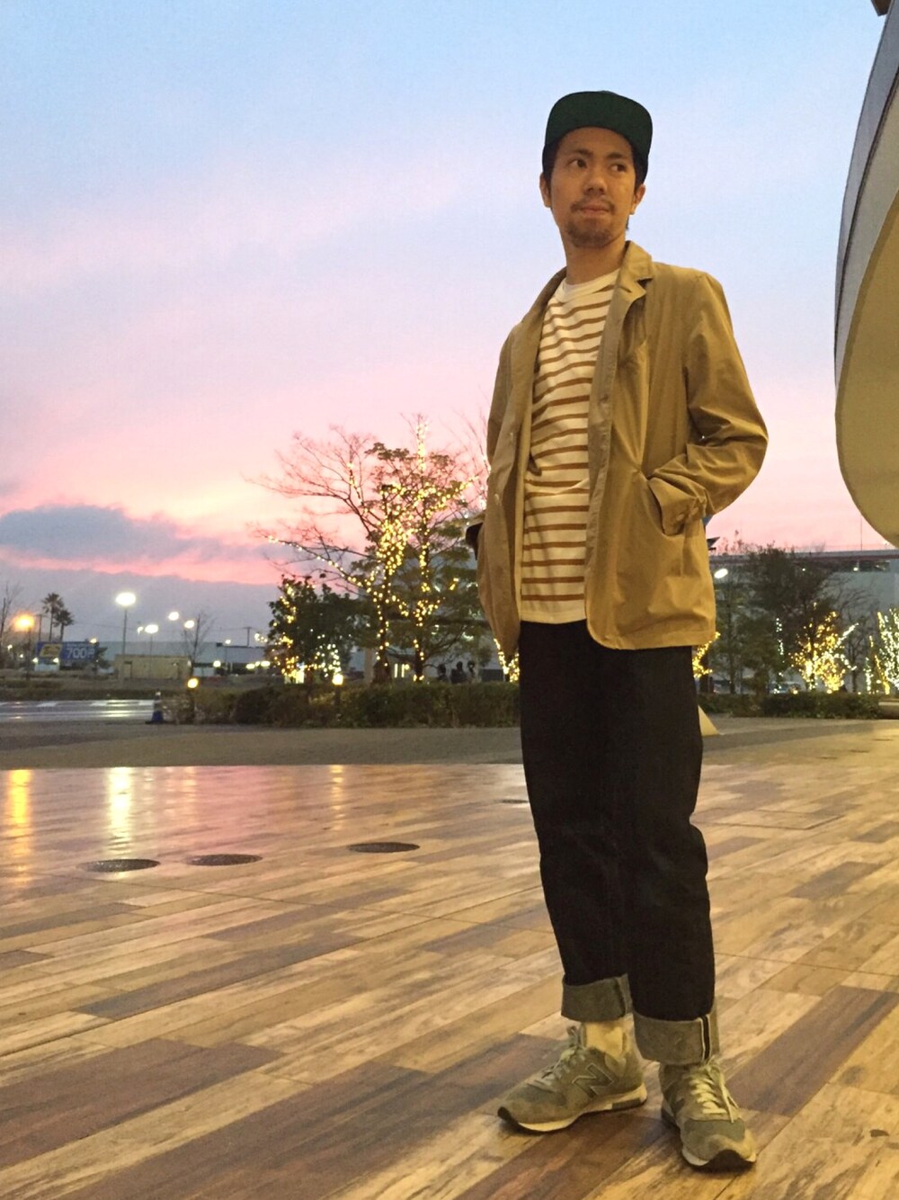 珍しく外で撮影です。 幕張の夕焼けは絶品です。 ジャケット、デニムのスタイルはキャップを使ったり、ロールアップを大きくしたり、と遊びが大事です。 是非、ご参考に。