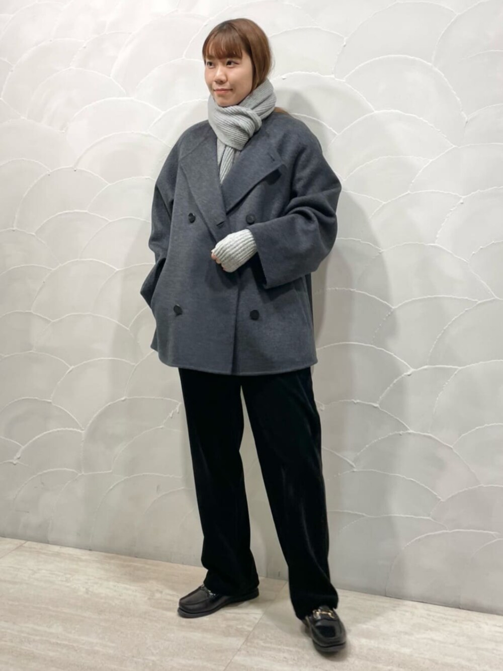ふっくらとした柔らかさと軽さが特徴の〈GALERIE VIE〉定番ショートコート。 ボタンの開閉で印象を変えることもでき、様々な着こなしが可能です。 今季トレンドのグレートーンに赤を差し色で効かせたスタイリングに。