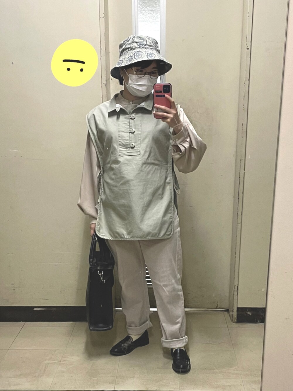 今日の便所前コーデ フィッシャーマンベストめちゃんこ可愛い色