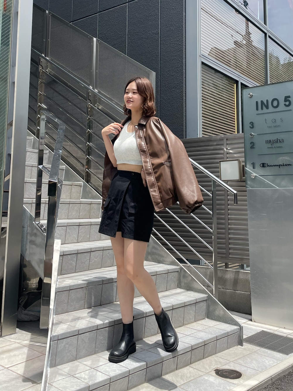骨格タイプ:ストレート ● オーバーサイズフェイクレザージャケット[color:ブラウン/size:M] 腰あたりまでの丈感で、袖丈も手の甲の真ん中ほどまであります。軽めの着心地で、脇回りもゆとりがあり、なんにでも羽織りやすいです。光沢がありすぎない生地感もおすすめです。 ⚫︎ 2WAYホルターネッククロップドタンクトップ[color:ホワイト/size:F] ホルターネック付きで私は外して着用しています。胸元にリボンを通すところがあり、そこから首の後ろでリボンを結ぶ形です。伸縮性が高く着心地はとてもいいです◎ ● カーゴミニスカパン[color:ブラック/size:F] フロントのボタンはフェイクで、サイドからバックにかけてのゴムデザインで楽に着脱可能なデザインです。シワが気になりにくく、軽量感のある素材です。太ももの三分の一位の丈感なので。短すぎず高身長の方にもおすすめです◎