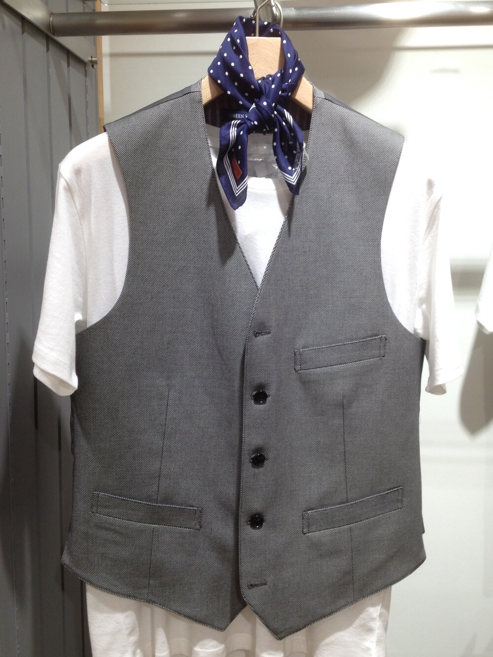 お店でディスプレイされていたコーデ。 白Tシャツにベストを羽織るだけでこんなにダンディになるとは。ベスト欲しい。 極めつけは首に巻いたネイビーのドット柄ハンカチ。上品さをプラスし全体を引き締めて視線が首もとへ。 まぁ実際ハンカチ巻いたら苦しそうですが…汗