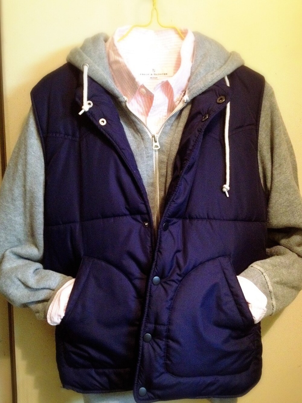 友達から一年前のナノユニバース福袋に入っていた中わた入りのベストをもらった。着こなしがわからないのか全然着てなかった模様。 パーカー:グリーンレーベルリラクシング