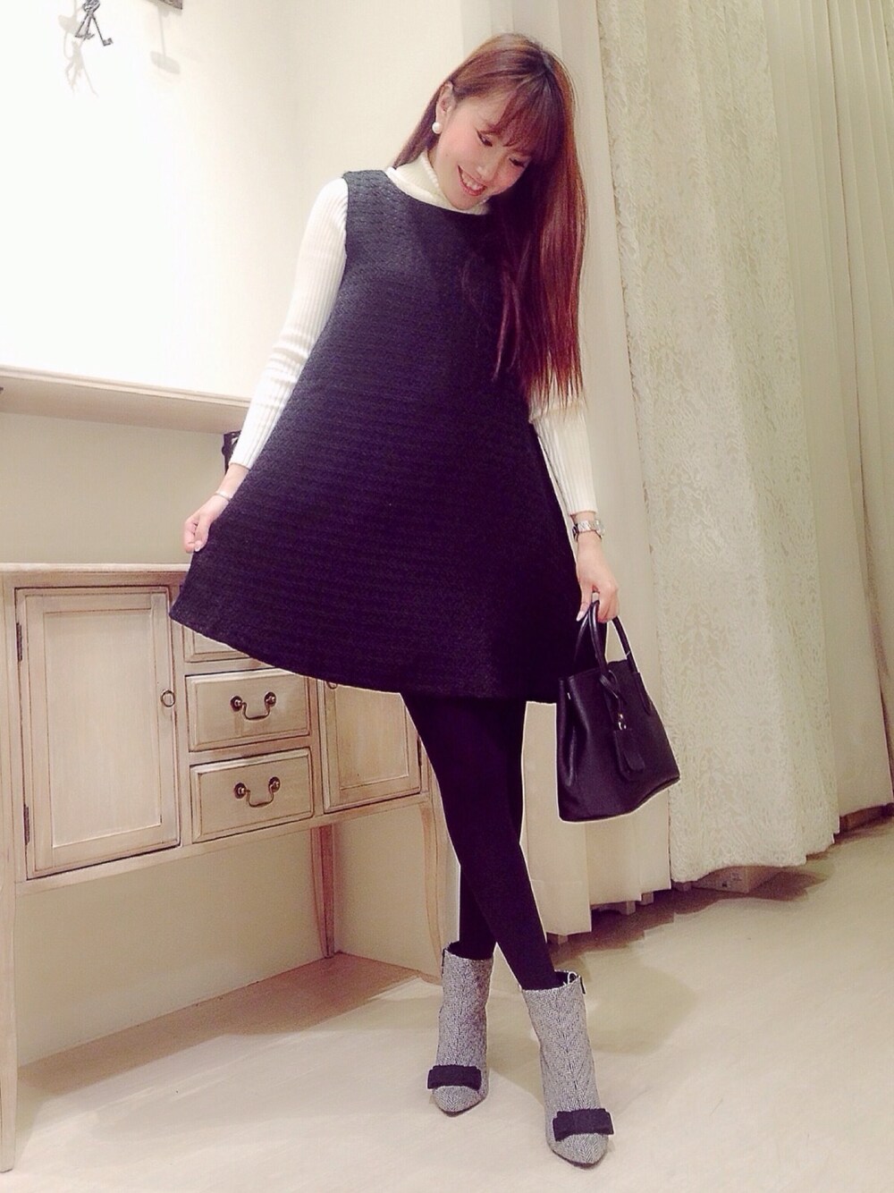 Aラインの形が綺麗なワンピース✨ 広がりかたも上品で、、 タートルネックと合わせると あったかいし、可愛いです😮❤️