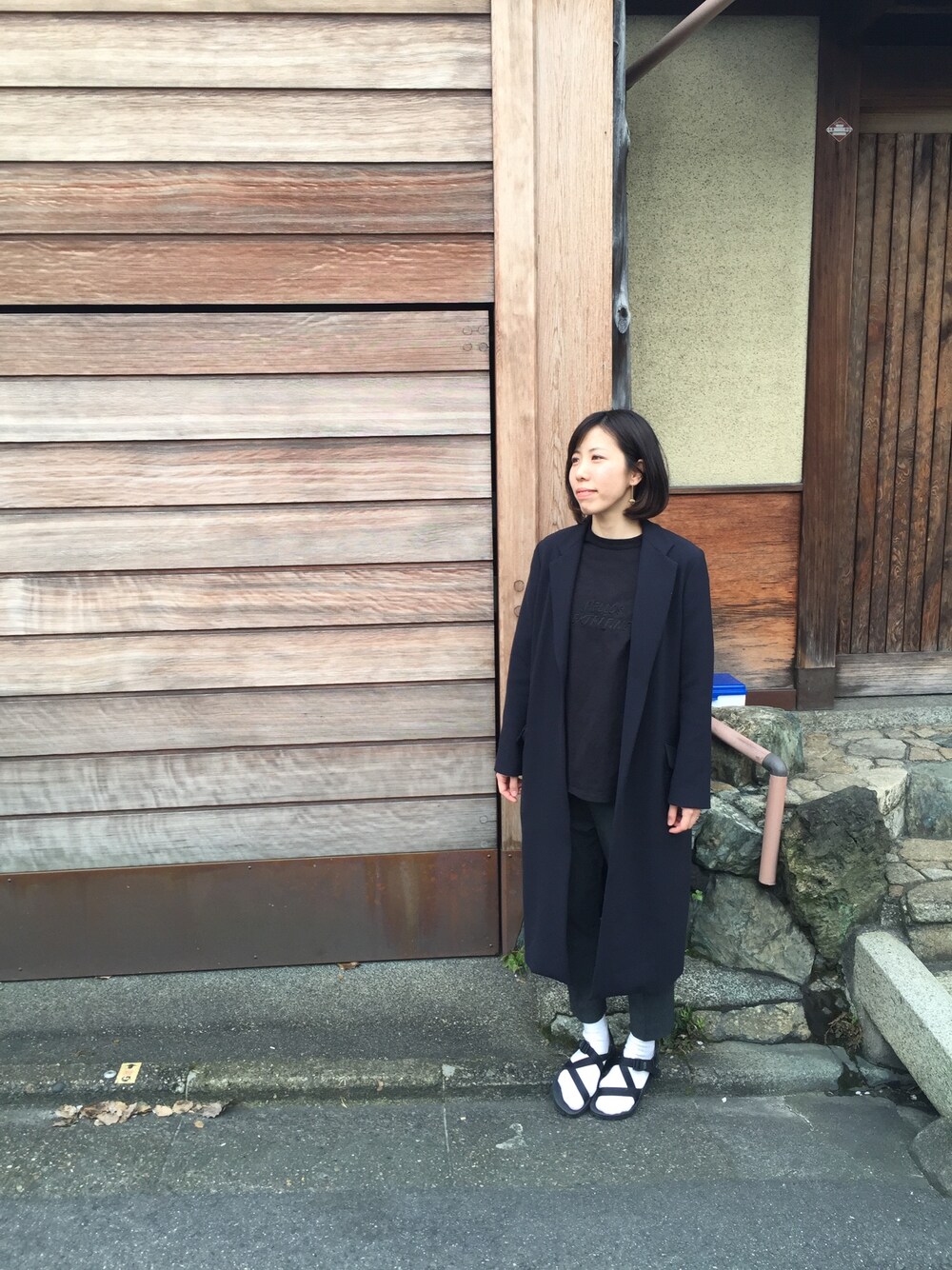 今日はぶらりと京都をお散歩しました。 1LDKで買ったMYのロングジャケットがお気に入りです◎ スラックスはYAECA TシャツはChampion Chacoサンダルかける白くつ下