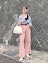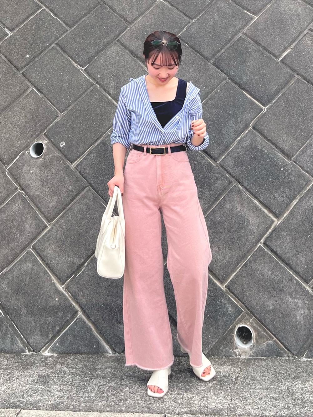 ピンクデニム…🩷 ピンクの甘さをトップスのネイビーとブルーで中和した大人かわいいコーデ♡ 少しずつ秋を意識していきたいと思いつつ、、暑すぎるので上着で調節できるスタイルが定番です🫠