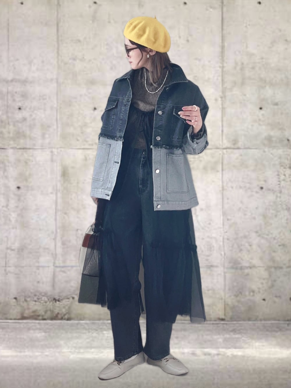 UMiSatoのデニムジャケット「配色スパンデニムジャケット」を使ったコーディネート
