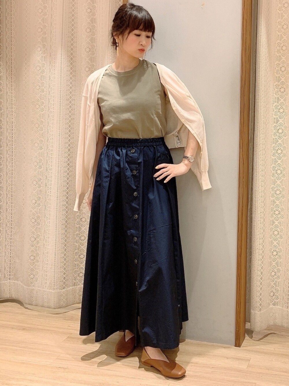 ノースリーブカットソー×カーディガン羽織り✨ スカートは前ボタン、後ろボタン、サイドボタンの3wayデザインです♡