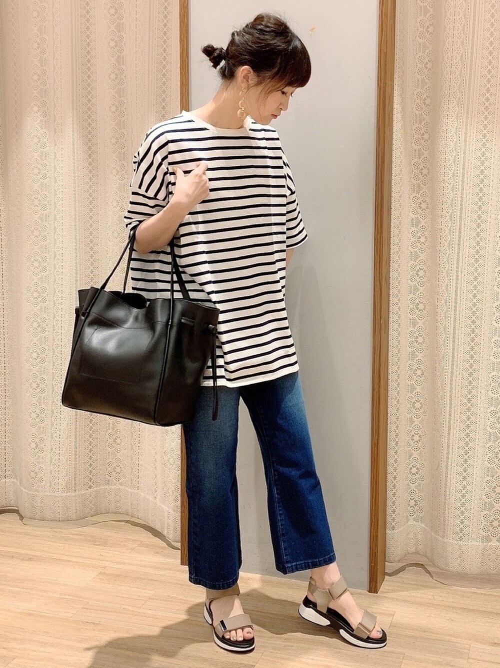 BIGボーダーカットソー×デニムフレアパンツ