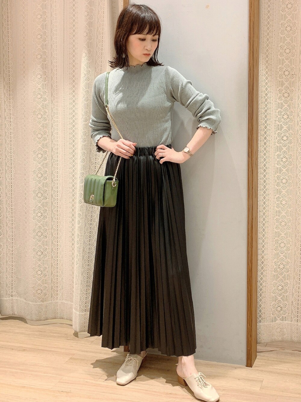 とても伸び感があるメローリブニット×フェイクレザープリーツスカート🌸