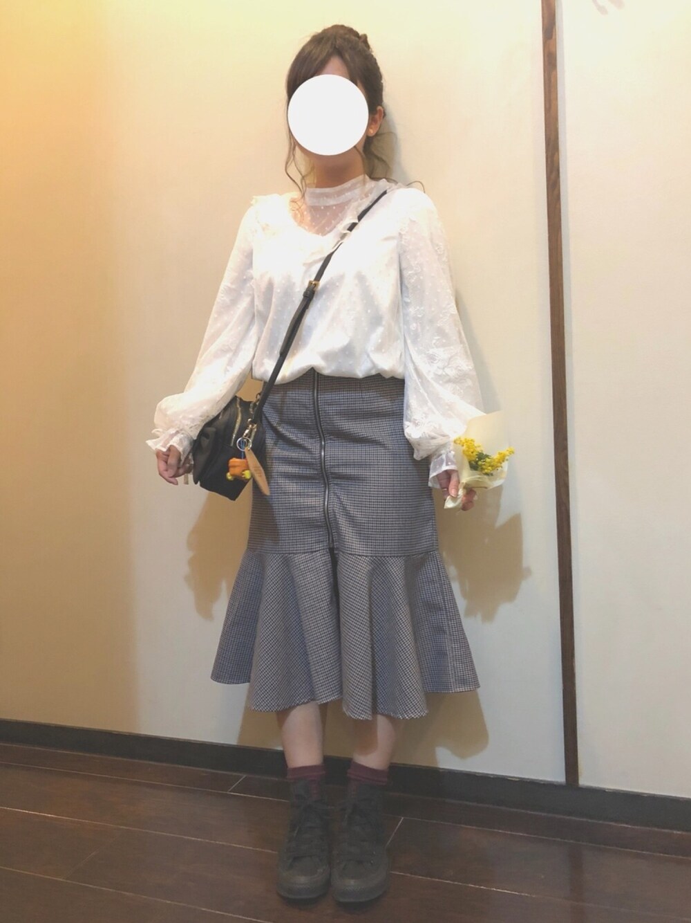 暖かい日のコーデ💗 ミモザのお花をもらったよ🌼 お花をもらうって嬉しい!