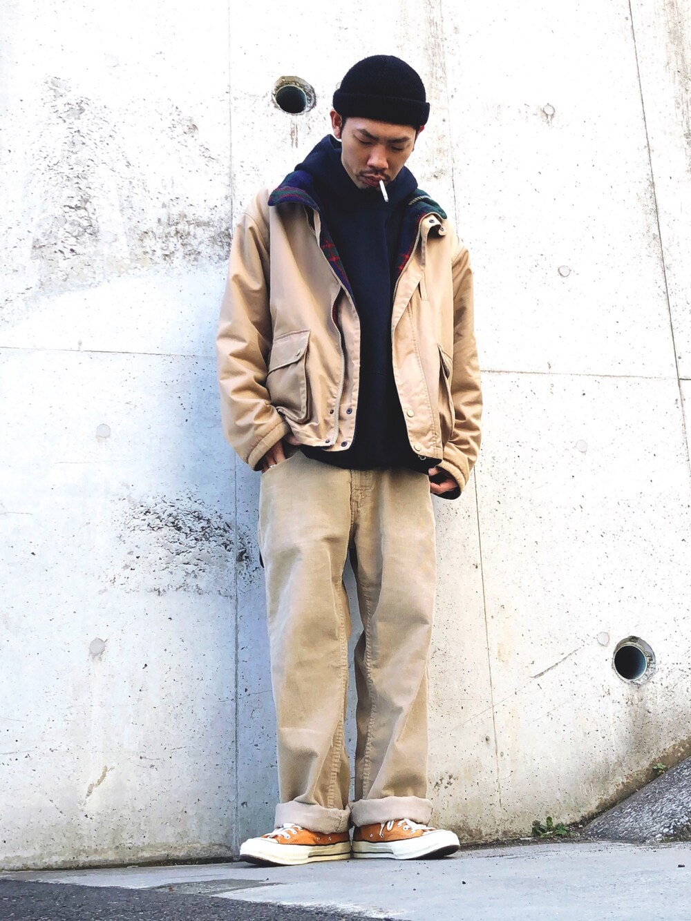 今日の出勤スタイル👕👖👟 寒かったので、厚手アウターに逆戻りです🙄 ワントーンコーデですが、インナーとキャップにブラックをいれてやり過ぎない様にしてみました👌👌👌