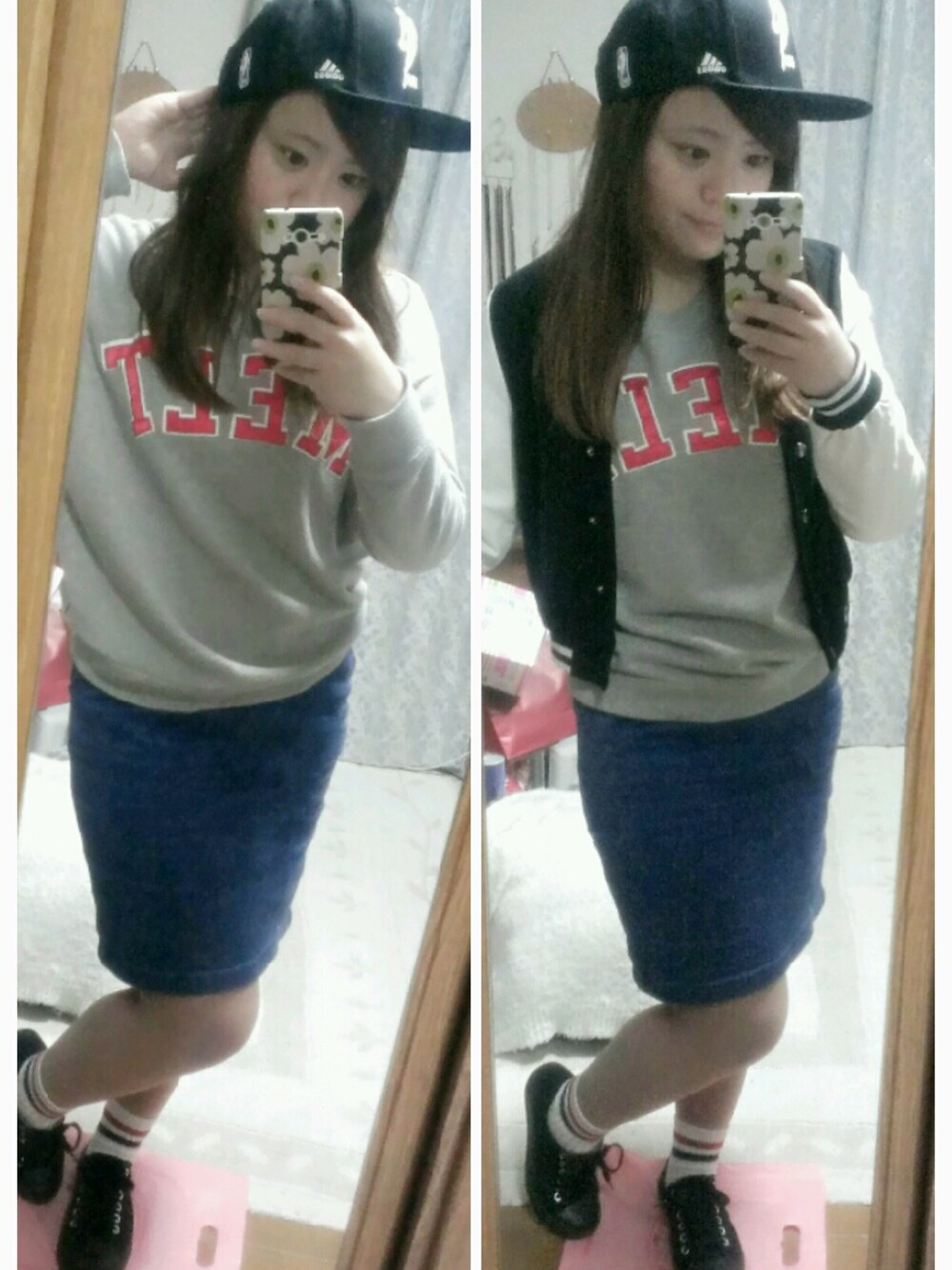 お花見 行った時のコーデ♪♪ スニーカーで動きやすくo(^o^)o スタジャン:エムズエキサイト ロゴスウェット:RETRO GIRL タイトスカート:RETRO GIRL ラインソックス:tutu anna スニーカー:GU キャップ:adidas