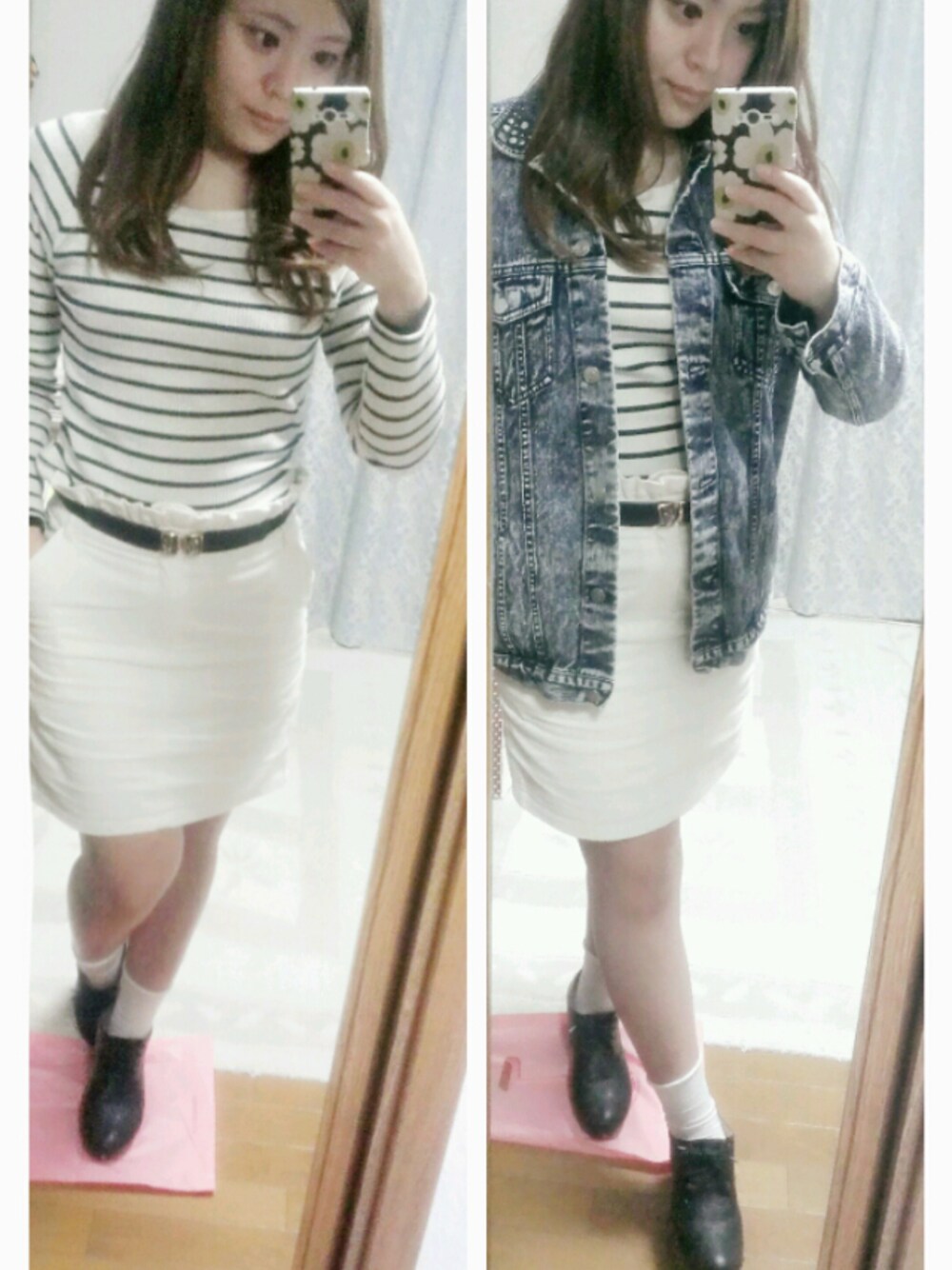 全体的に白が多めだから 靴を黒にして引き締め効果! トップス オフショル だけど少ししか 肩がでないので着やすいです♪ デニムジャケット:GU トップス :RETRO GIRL タイトスカート :NICE CLAUP 白ソックス :tutu anna