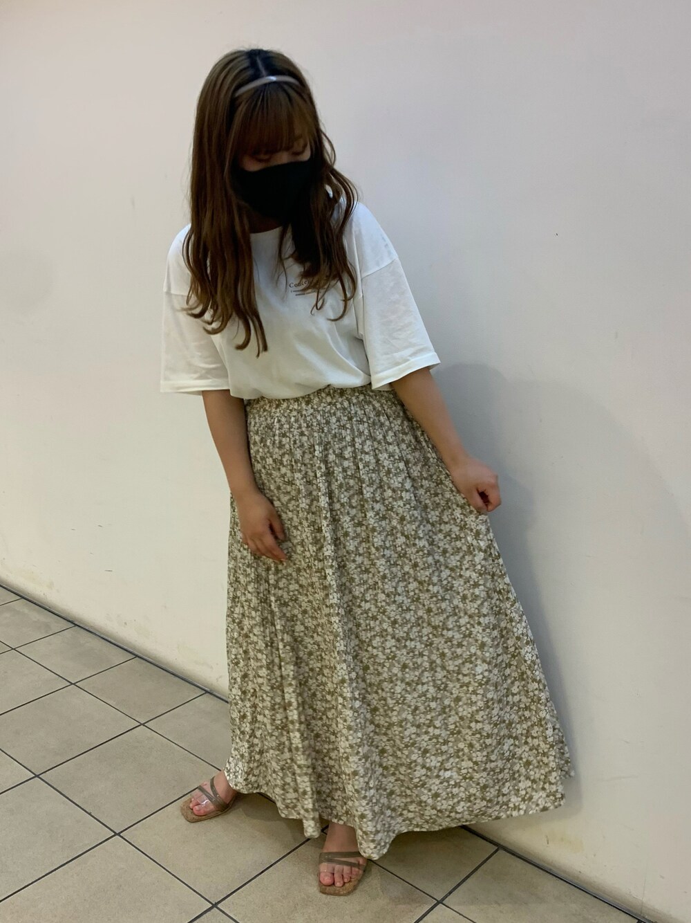 少し甘めなコーディネートに✨ Tシャツはバックプリントが入っていてめちゃくちゃ可愛いんです💕 (後ろがわかる写真じゃなくてごめんなさい🙇🏻♀️🙇🏻♀️) スカートは泊プリントのデザインで キラキラ光るので華やかな印象で履けちゃいます☺️☺️