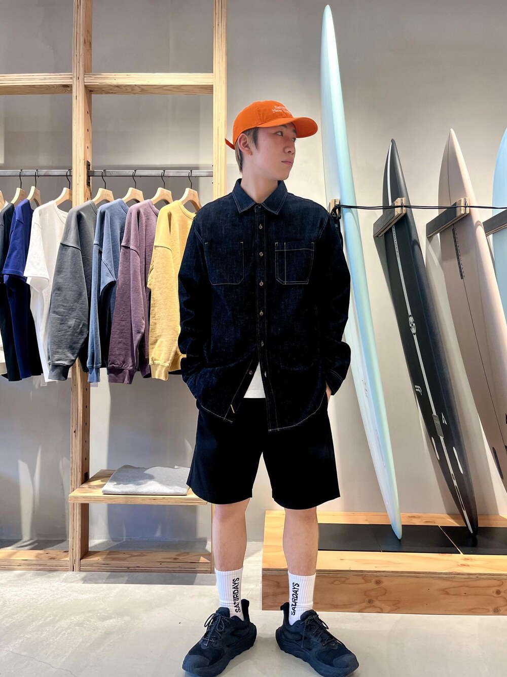 こんにちは! 今回はSaturdays NYCの定番スタイルの一つでもある、 デニムシャツを使ったコーデです! デニムシャツを一枚持っていると、汎用性が高いアイテムなのですごく重宝してます! パンツは今回ショーツで合わせていますが、チノパンやスラックス合わせもオススメです! キャップは大人気のロゴキャップです! 少し色味が欲しかったのでオレンジにしましたが、黒やチャコールグレーなど使いやすい色もあるので是非! 気になった方はお近くのSaturdays NYCまでお越し下さい!