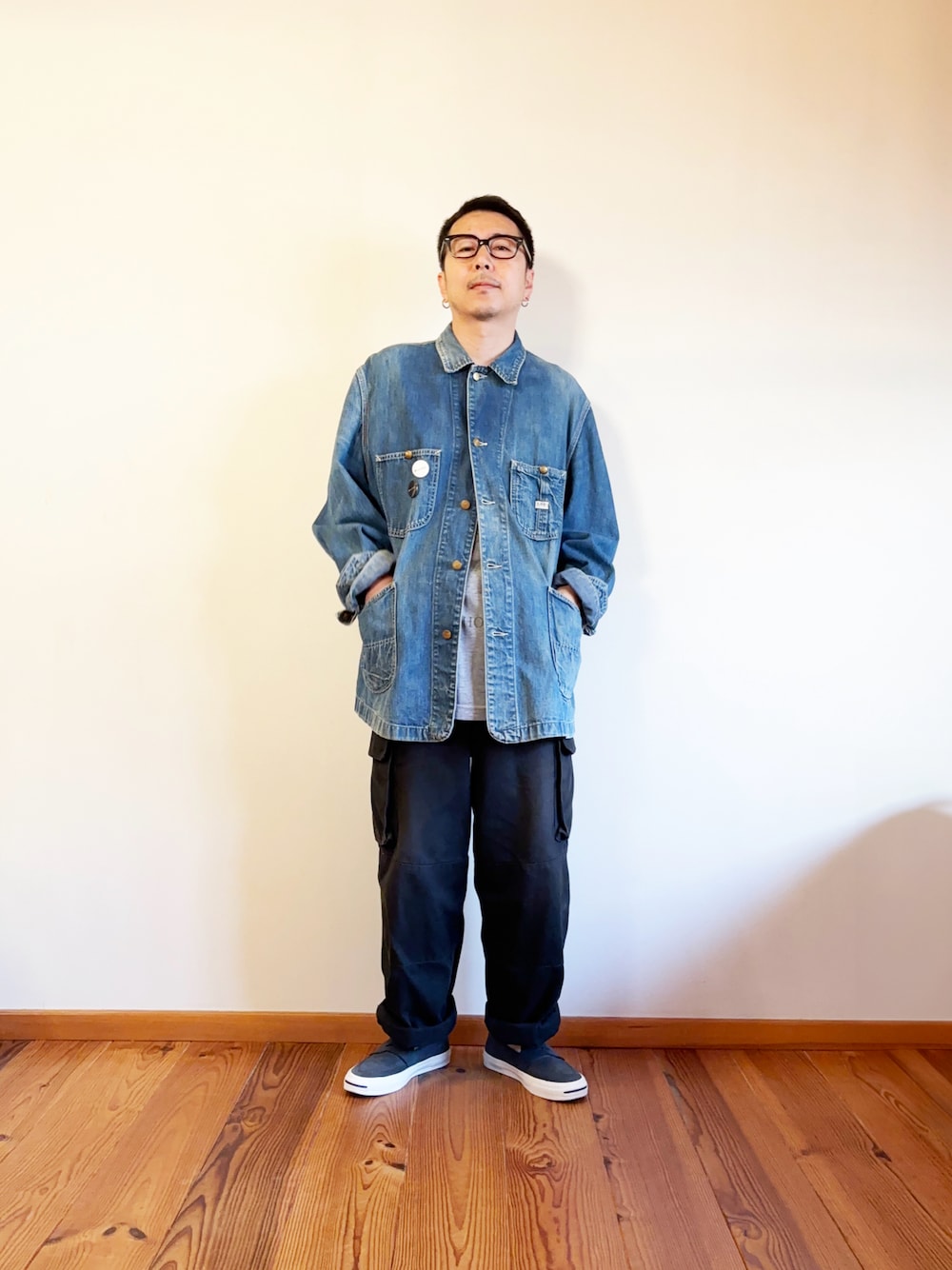 Jacket:古着 70年代 Lee デニムカバーオール Pants:フランス軍M-47パンツ レプリカ Sneaker:JACK PURCELL LOAFER 今日のコーディネートは、70年代のLeeデニムカバーオールをメインにスタイリング🧢✨ このLeeのカバーオールは、シンプルだけど細かいディテールや風合いが抜群で、デニムならではの経年変化が楽しめる一着。ちょっとルーズに着こなせるLサイズ感も気に入ってます👌 パンツはフランス軍M-47のレプリカで、ミリタリーらしい無骨さをプラス。ワイドなシルエットが今のトレンドにもしっかりハマって、ヴィンテージ感を引き立ててくれます。 足元はクラシックなJACK PURCELL LOAFERで、全体をバランス良く引き締めつつ、少し抜け感を出してカジュアルダウン。ミリタリーとヴィンテージを組み合わせた、シンプルだけど存在感のあるコーデに仕上げてみました🔥 ヴィンテージアイテムやミリタリースタイルが好きな人、ちょっと変化を加えたカジュアルコーデを楽しみたい人にはぜひ参考にしてもらえたら嬉しいです