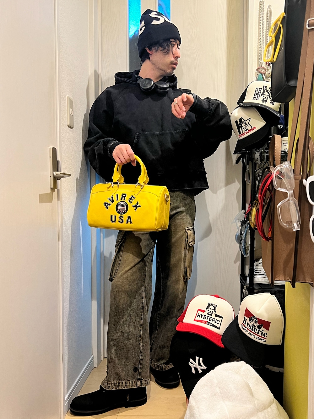 shinyaのボストンバッグ「《直営店別注》VARSITY MINI DUFFLE BAG / バーシティ ミニ ダッフル バッグ / AVIREX / アヴィレックス / AVX5624」を使ったコーディネート