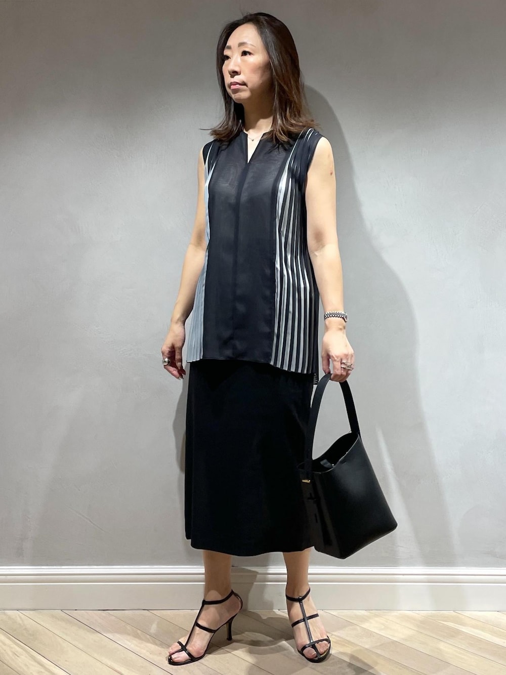 シンプルなのにプリーツのデザインがオシャレなブラウスに、ロペで人気のポケット付きタイトスカートを合わせて夏の通勤コーデの完成!! ブラウスはインせずオーバーでも格好良く着れて、風が抜けるので涼しいです♩ パンツとのコーディネートもオススメ!!