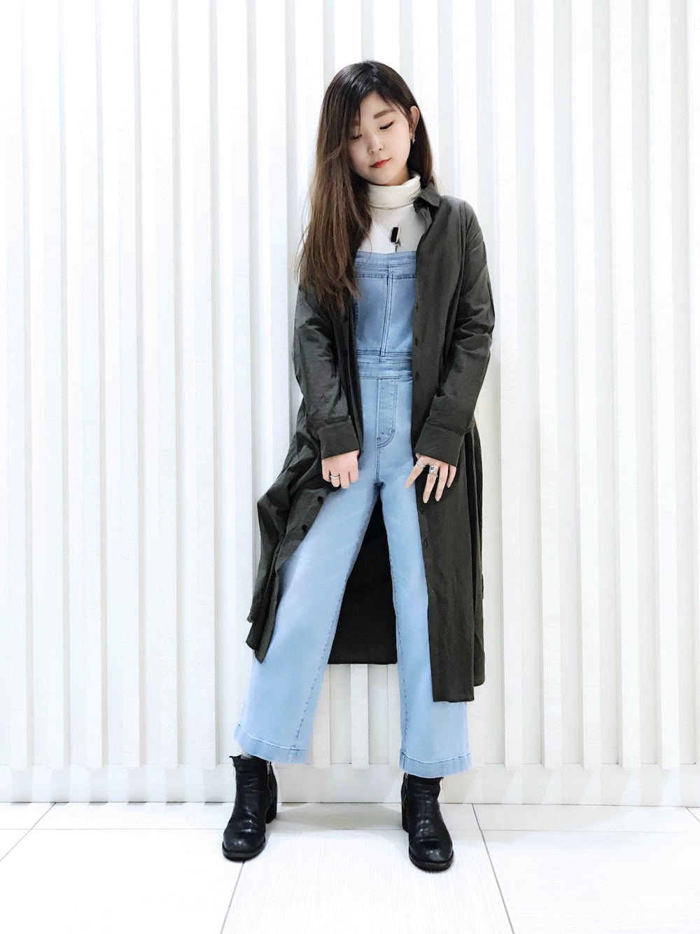 タートルで冬感を残しつつ、薄手のロングシャツを羽織って春を意識したデニムコーディネート🌎