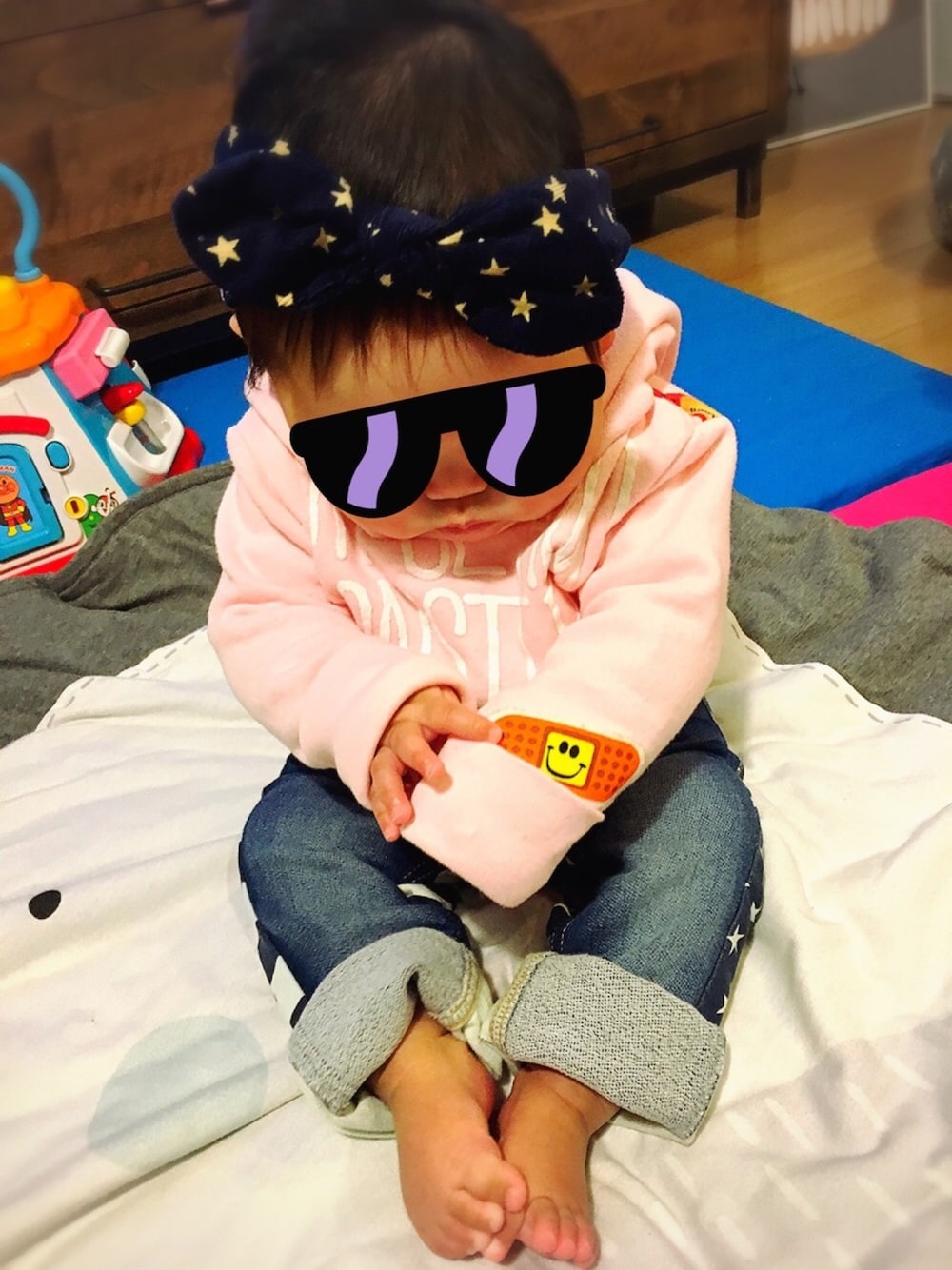 赤ん坊初デニムww バックスタイルのが星がいっぱいで可愛いんやけど、まだ立てない(>人<;)