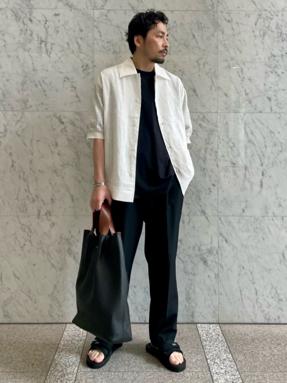全体をモノトーンで構成したシンプルなスタイリングです。 ニットとドッキングした半袖シャツが、単調になりがちな、今の時期のスタイリングに程よくアクセントを加えてくれます。