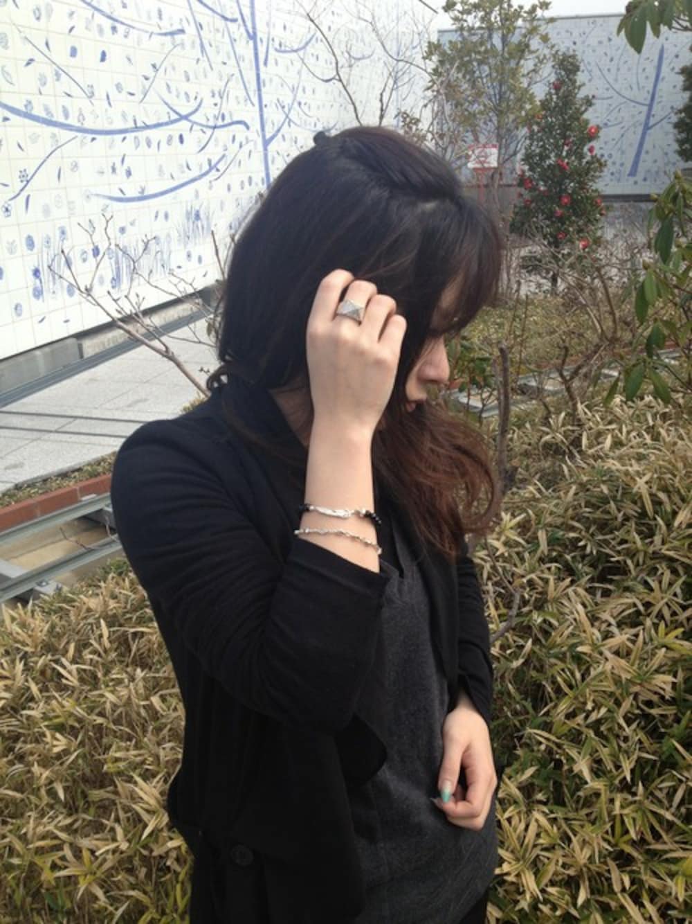 新作のオニキスのブレスレットと定番のチェーンブレスレットを重ね着け。 手元にはエッジの効いたリングで ローリー・ロドキンらしいアクセントのあるコーディネートに仕上げました。