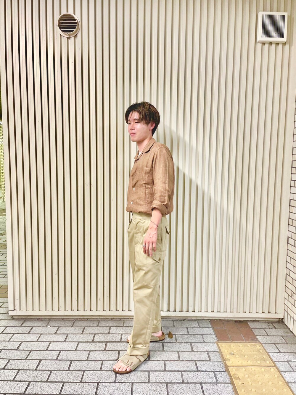 同系色でまとめました。 グルカパンツにタックインしてだいぶん大人っぽく、そしてサンダルで夏らしく