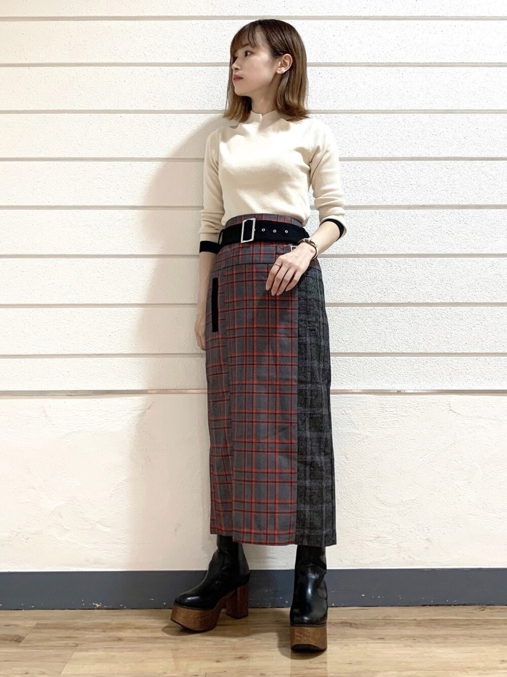 2種類の綺麗めのチェック生地と無地素材を使用したタイトスカート メランジ調のチェックの組み合わせで少しぼやっとするところを、無地配色のベルトをつけることでデザインを締めてバランスを取っています。 身体のラインが綺麗に見えるタイトシルエットながらも、バッグスリット入りで足さばきも◎ 着るだけでシーズンムードを演出してくれるアイテムです。